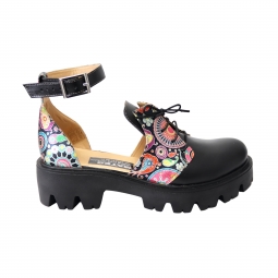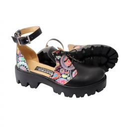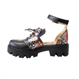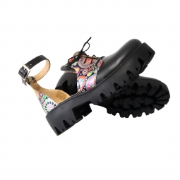 Sandale Dama Negre cu Imprimeu Colorat, Talpa Inalta, Catarama si Siret Miruna, Piele Naturala