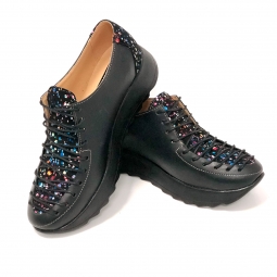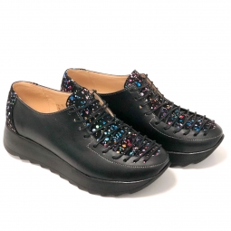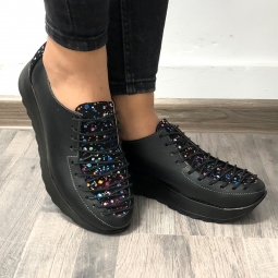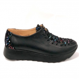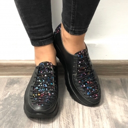 Pantofi Femei Negri cu Imprimeu cu Buline, Platforma si Siret, Piele Naturala Amanda