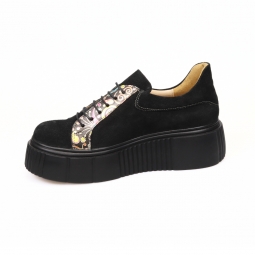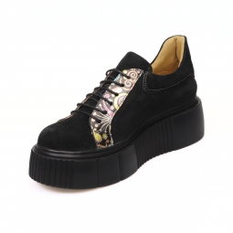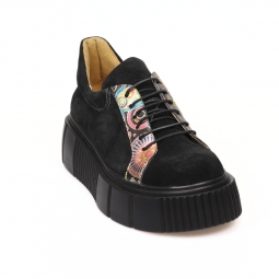 Pantofi Dama Casual Negri din Piele Naturala, cu Siret si Talpa Inalta Giulia, Imprimeu Colorat