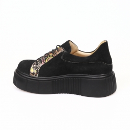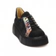 Pantofi cu Talpa Inalta Giulia, Femei, din Piele Naturala Neagra Velur si Imprimeu Colorat